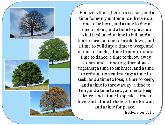 We would probably all agree that each life has many different seasons. But if you asked us what those seasons are, you might get as many answers as there are people! Some seasons are full of hope, peace, joy, and love, while others seem to bring only loss, failure, and broken-heartedness. This passage from Ecclesiastes doesn’t promise us good or ill. It comes alongside our season of life (whatever it is) and says there is a set time for it. There is no judgment or expectation that you should feel this way or that; that your failings have caused this; that God is punishing you. It just says – these things happen, but they are not permanent. Life is changing and changeable so find what you can in your own season. Make the meaning that you can; learn the lessons that offer themselves. Love where you can, heal where you can, embrace while you can. The seasons will change, but the steadfast love of the Lord endures forever. Thank God!