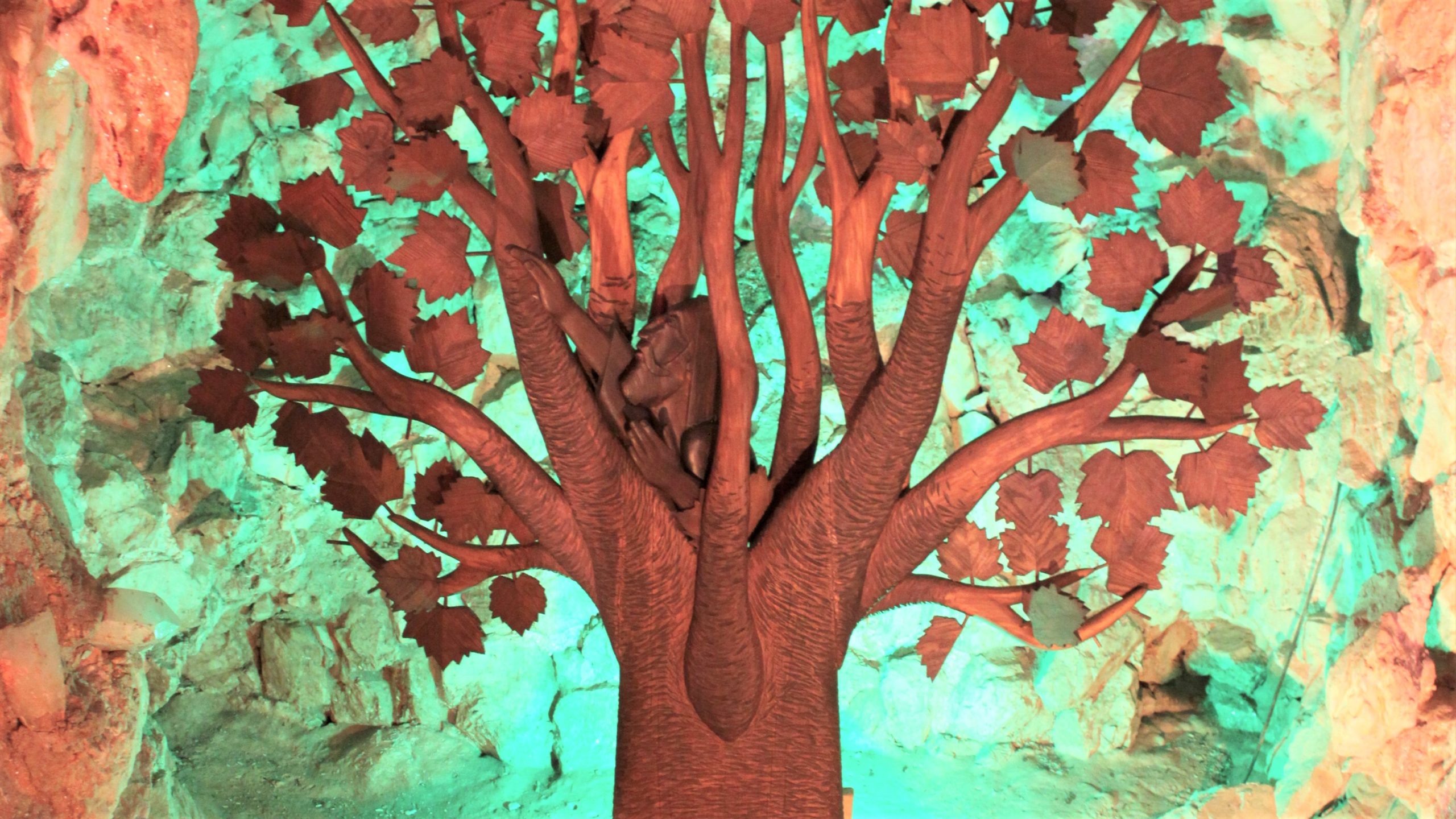 Image credit: “Crystal Shrine Grotto: Zacchaeus up a tree” by Dionicio Roriguez. Photo by Brent Moore, 2018.